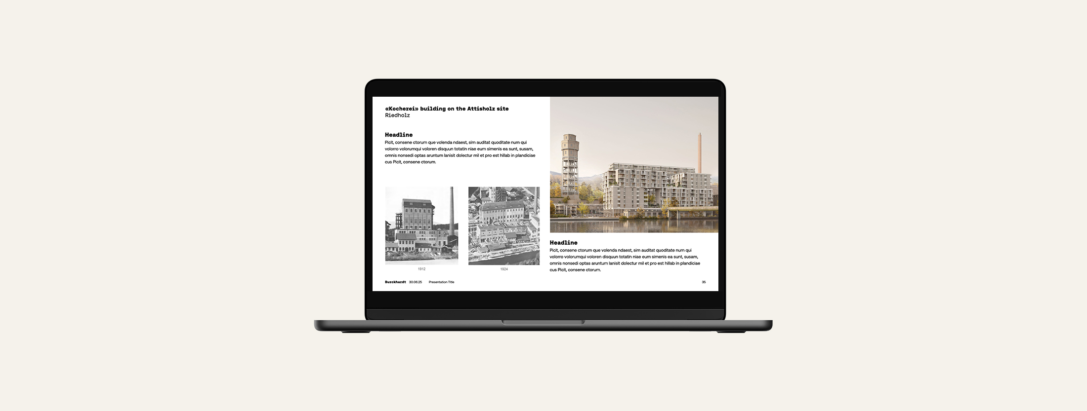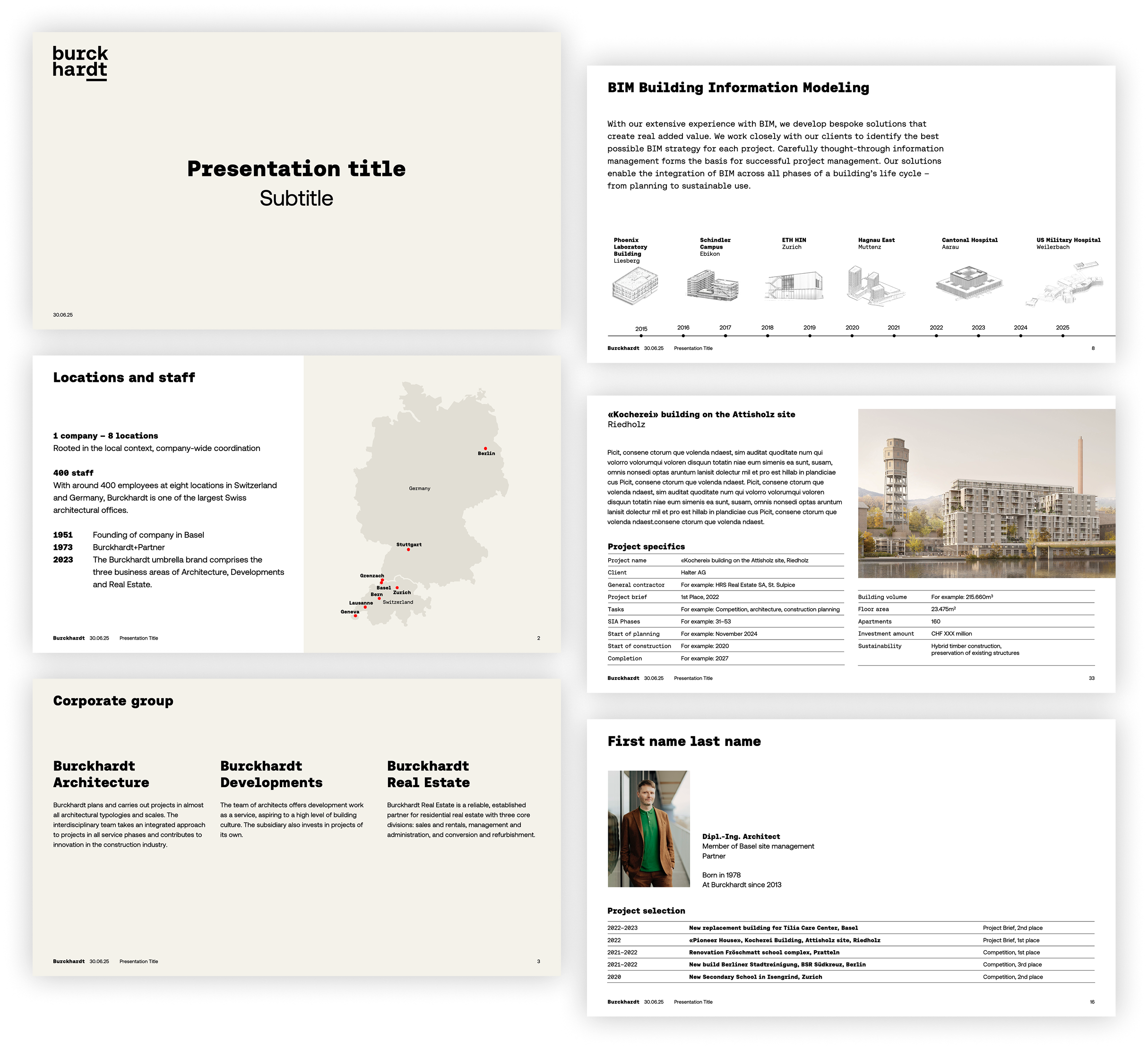 A PowerPoint template with sample slides can be found in PowerPoint>Neu>Burckhardt in German/English/French.The slides can be added to or removed as desired. The user is also free to adapt the content or change the layout.