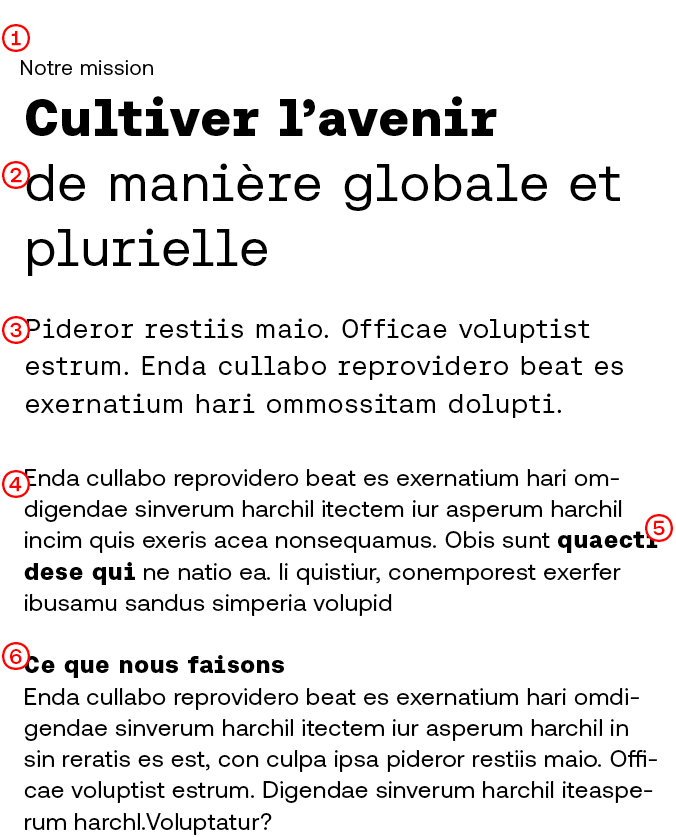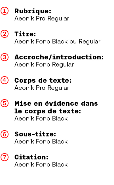 Pour les titres, la police Aeonik Fono Black est utilisée et pour les rubriques, la coupe coupe Regular. Les textes continus et les légendes sont composés avec la police Aeonik Pro.